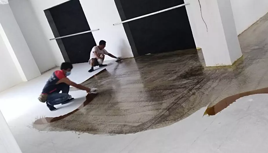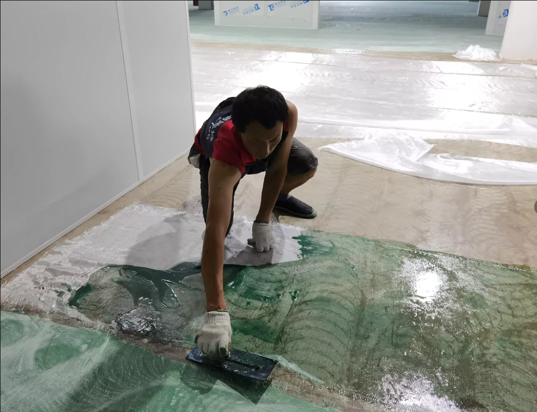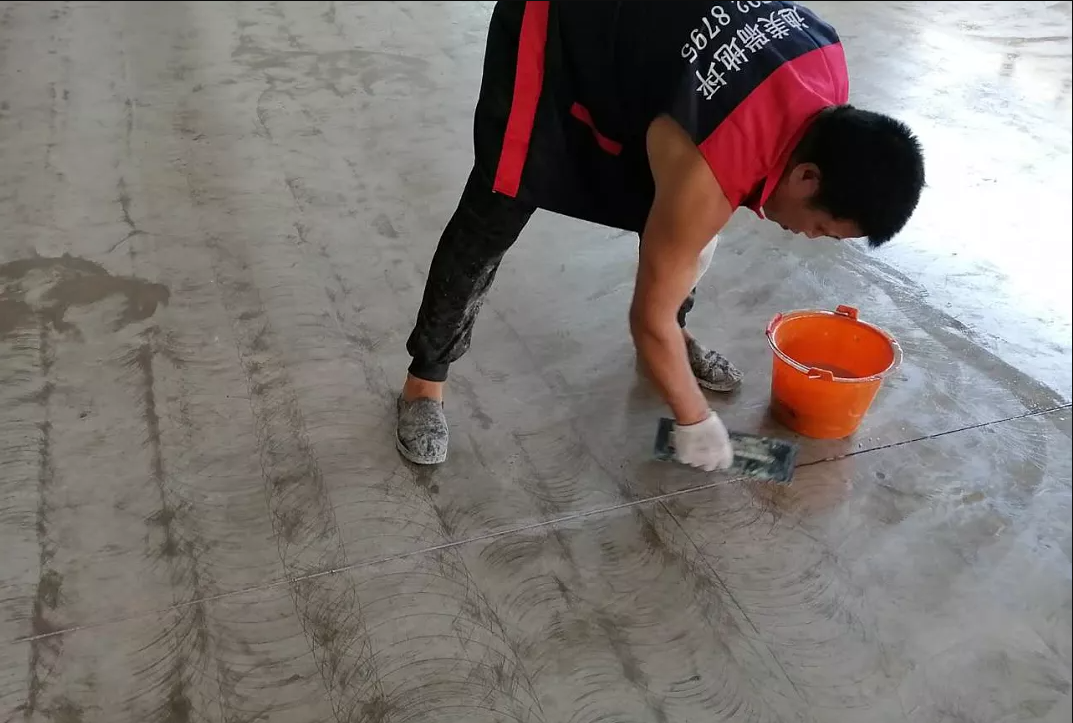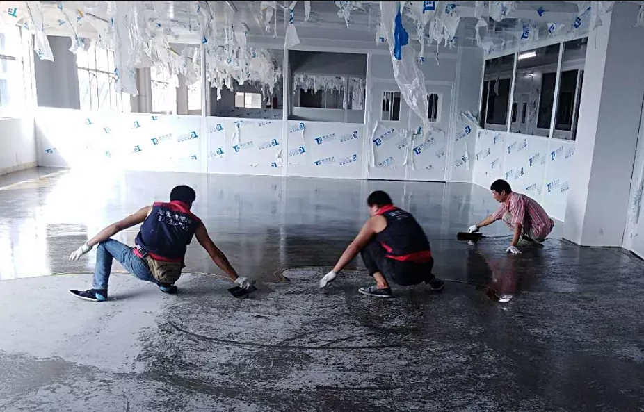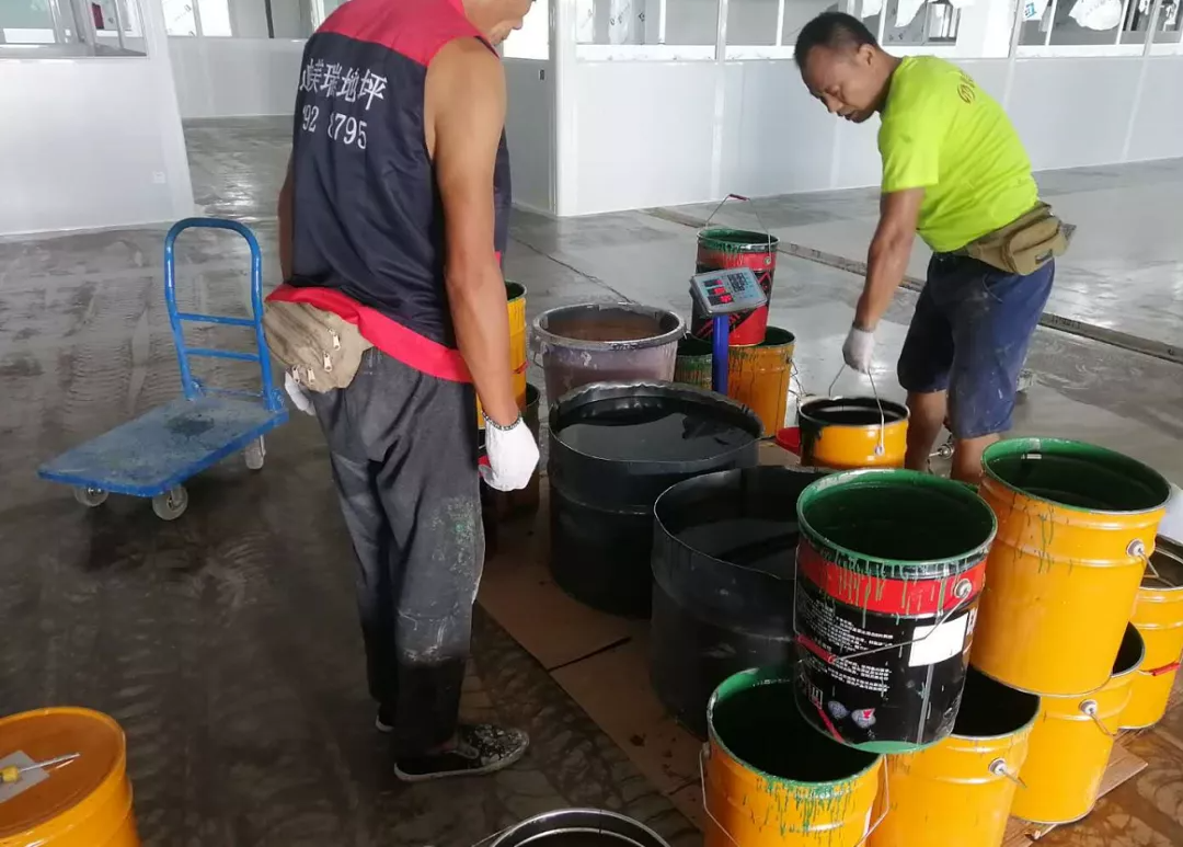 将调配好的面漆用镘刀或者辊筒均匀涂布,在完成后,达到地面整体光亮,颜色均一、没有空鼓现象。将调配好的面漆重复几遍,从而达到重防腐效果。